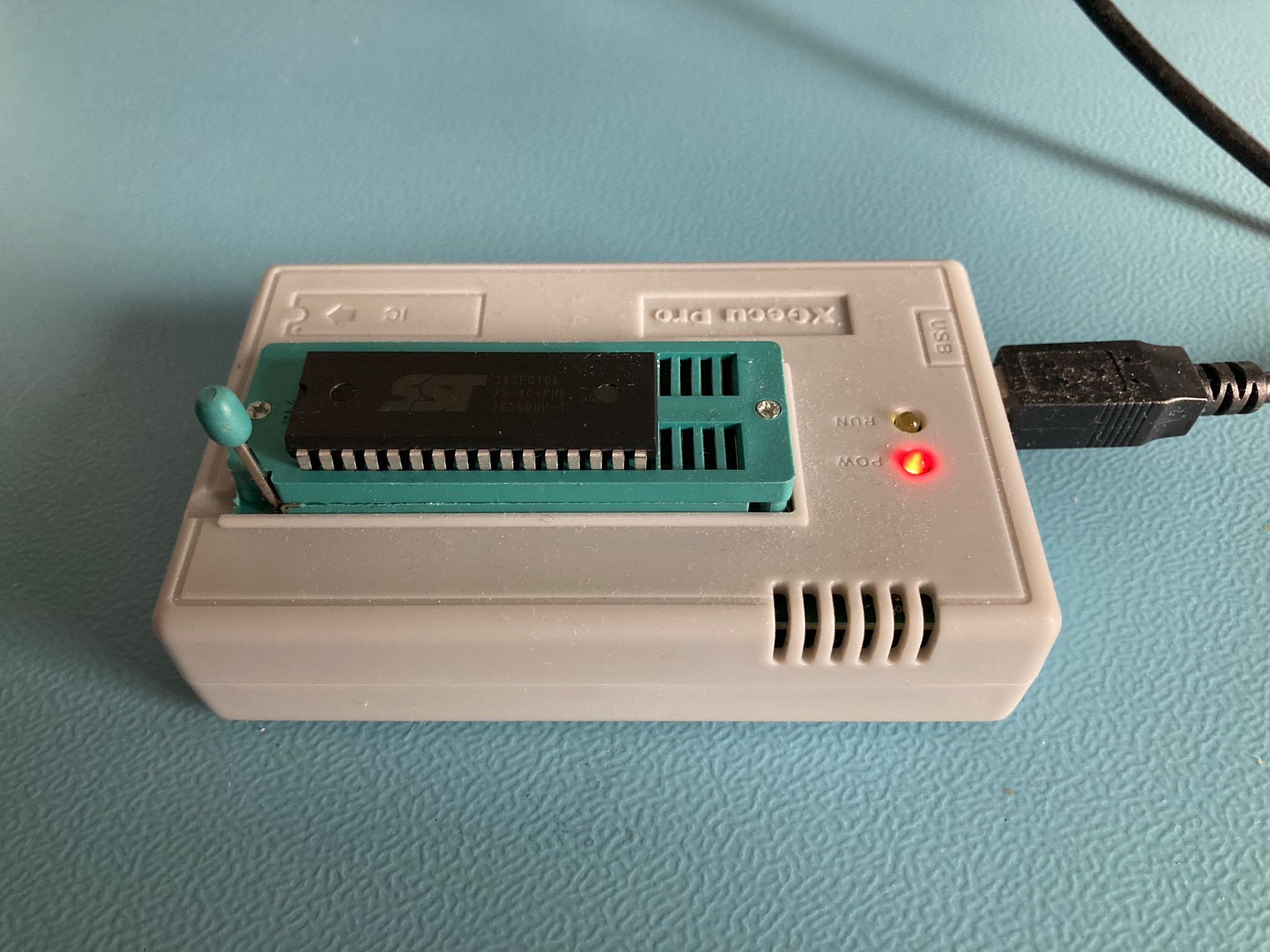My development cycle starts with writing the assembly/C source code on my Linux PC. Then use the z88dk development kit to generate the binary code. I copy this binary code to a Windows VM to program the NOR Flash using the, probably well known, TL866II plus programmer. Unfortunately, the ZIF socket of my TL866II plus isn’t of the greatest quality and I had to reseat the NOR Flash quite often to successfully program the NOR Flash
