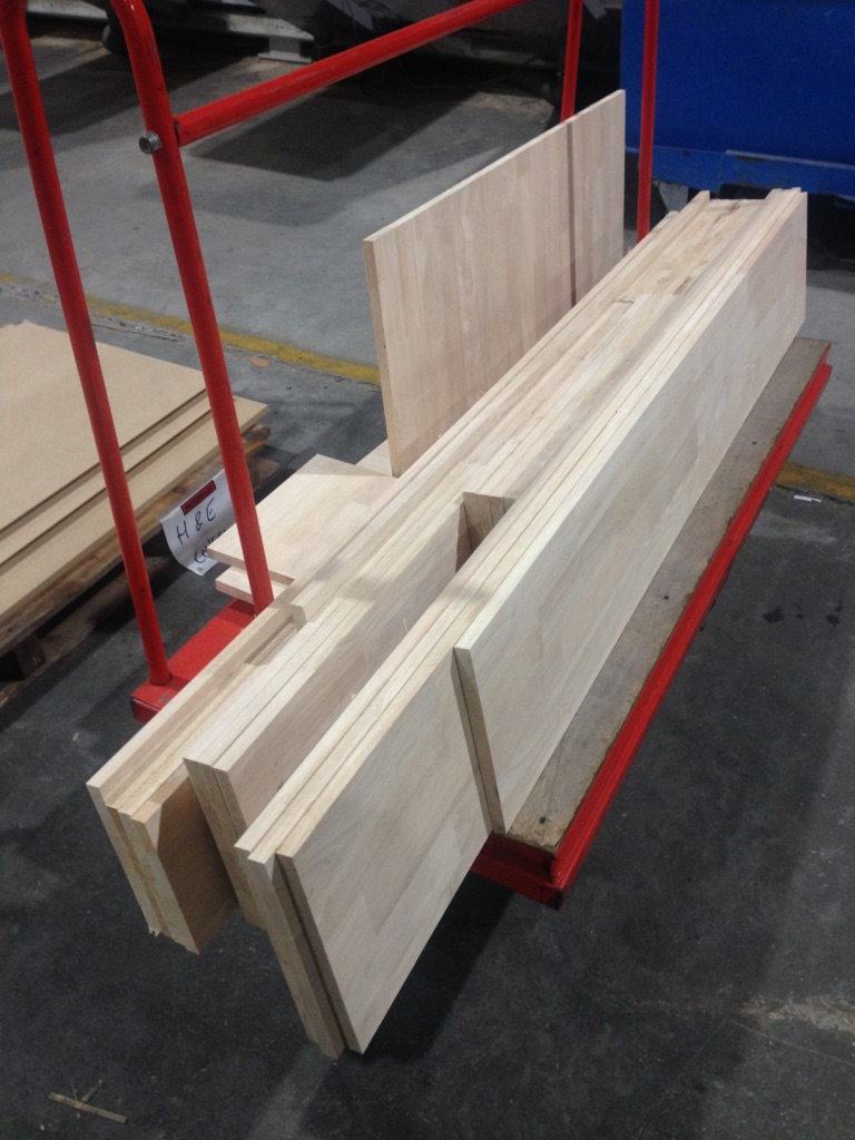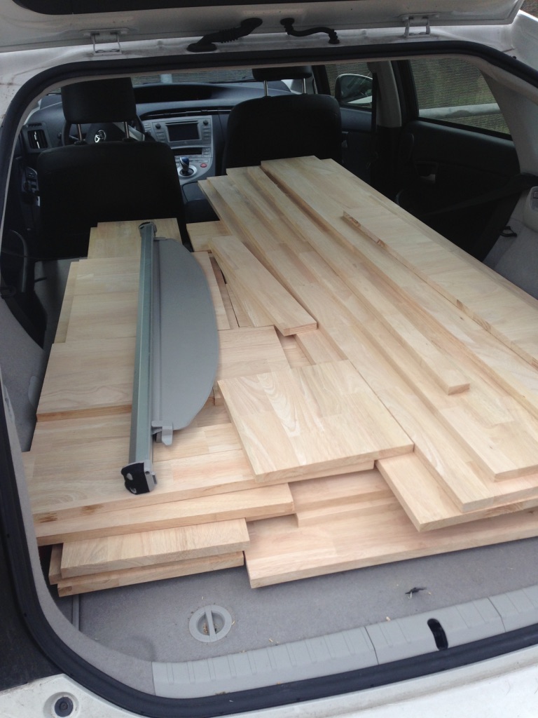 Since I do have a lot of books, this seemed like a good opportunity to try out if they could be used to reduce sound reflections from the wall behind my seat as well. The design I used looks a bit like the HiFi furniture I made earlier. So of I went again to the local woodshop and load the car with the needed planks they cut for me. This time I choose rubberwood of 18 mm thick.