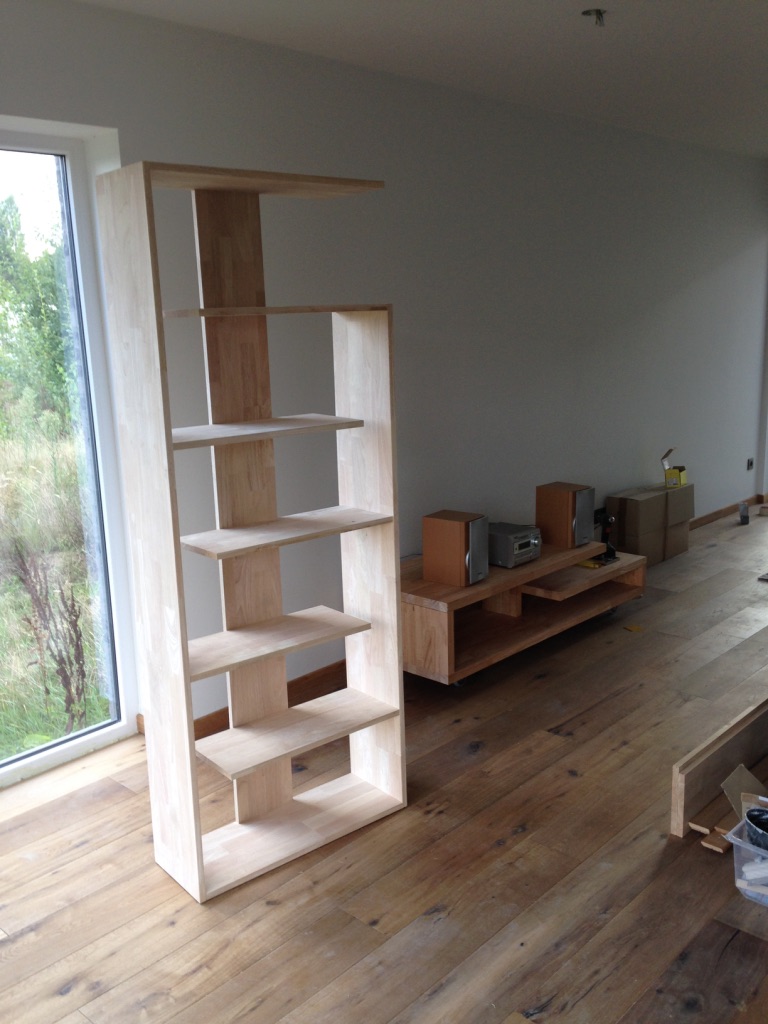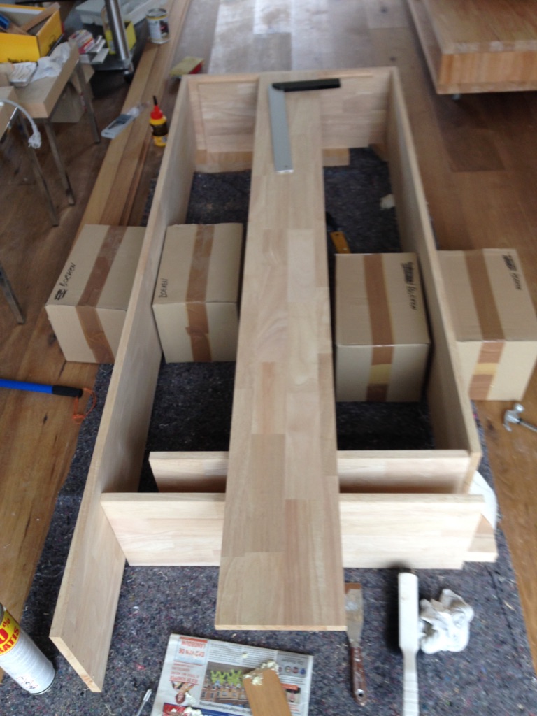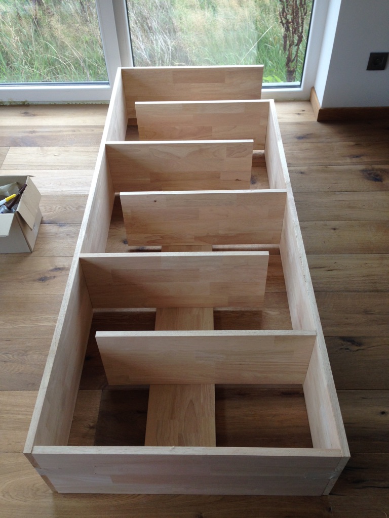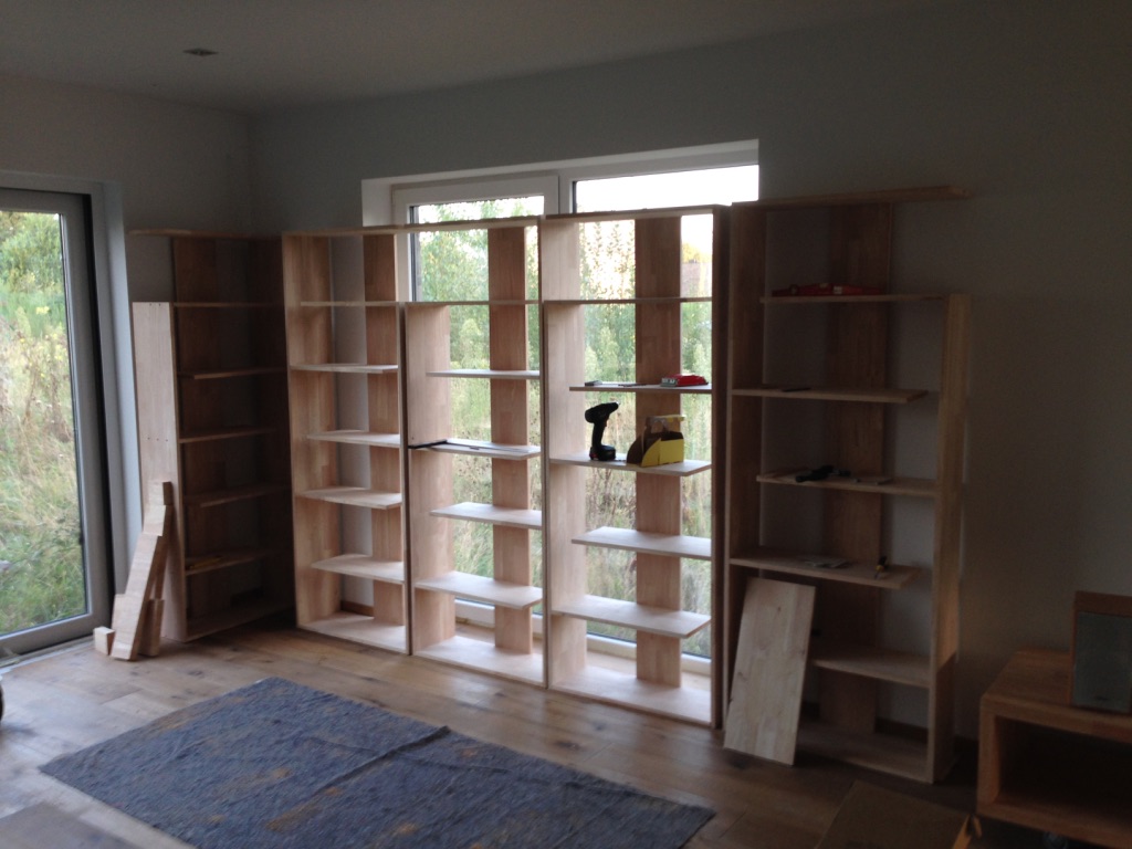 To see if I didn’t make any mistakes, I temporary assembled a bookshelf on the floor without fixing everything together. Looks good so far.