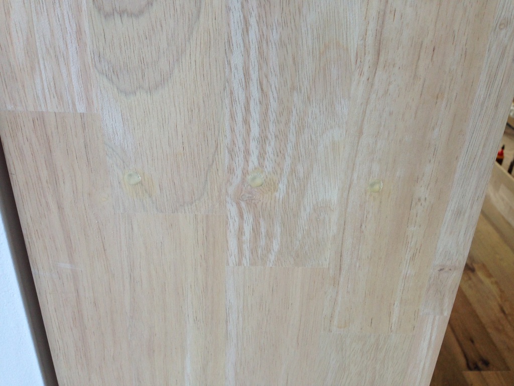 I found some wood filler with a color close to the color of the rubberwood. Perfect for covering the screws making them [nearly] invisible.