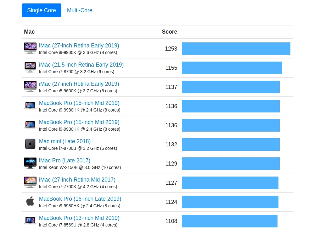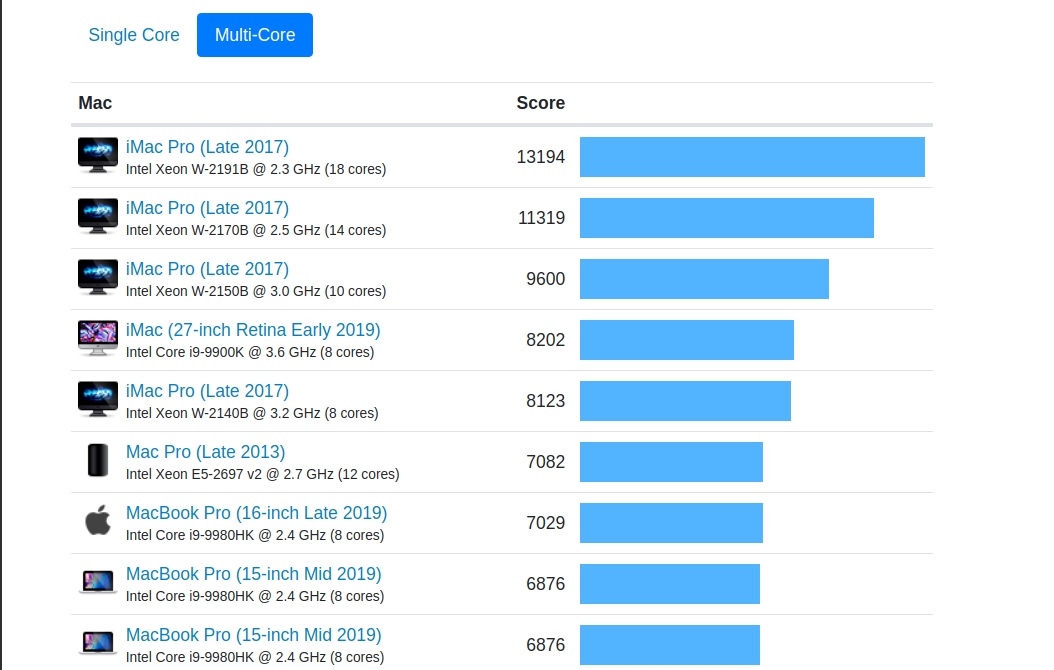 - iMac Pro (Late 2017) Intel Xeon W-2170B @ 2.5 GHz (14 cores), score 11319 7.419 Euro