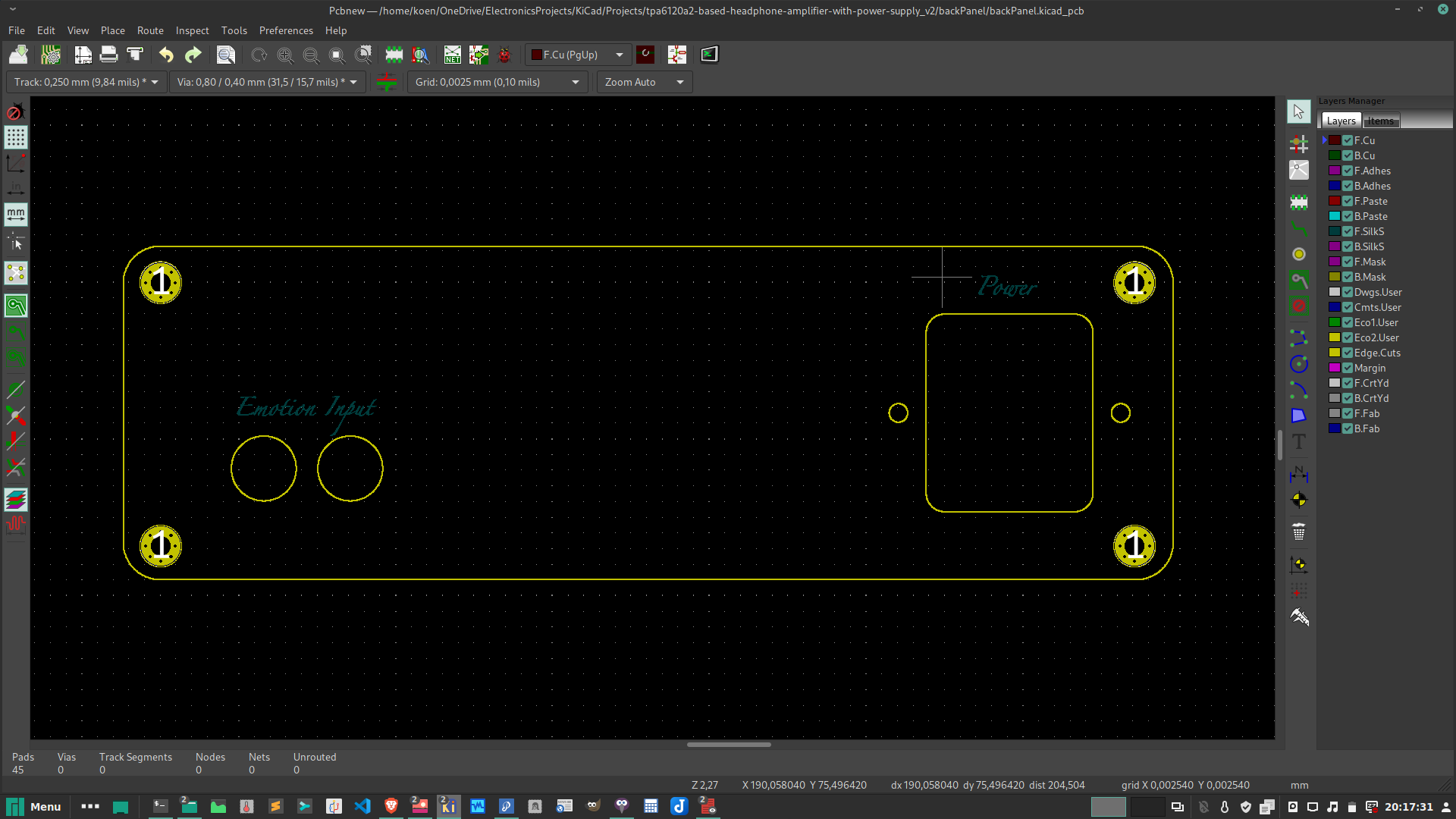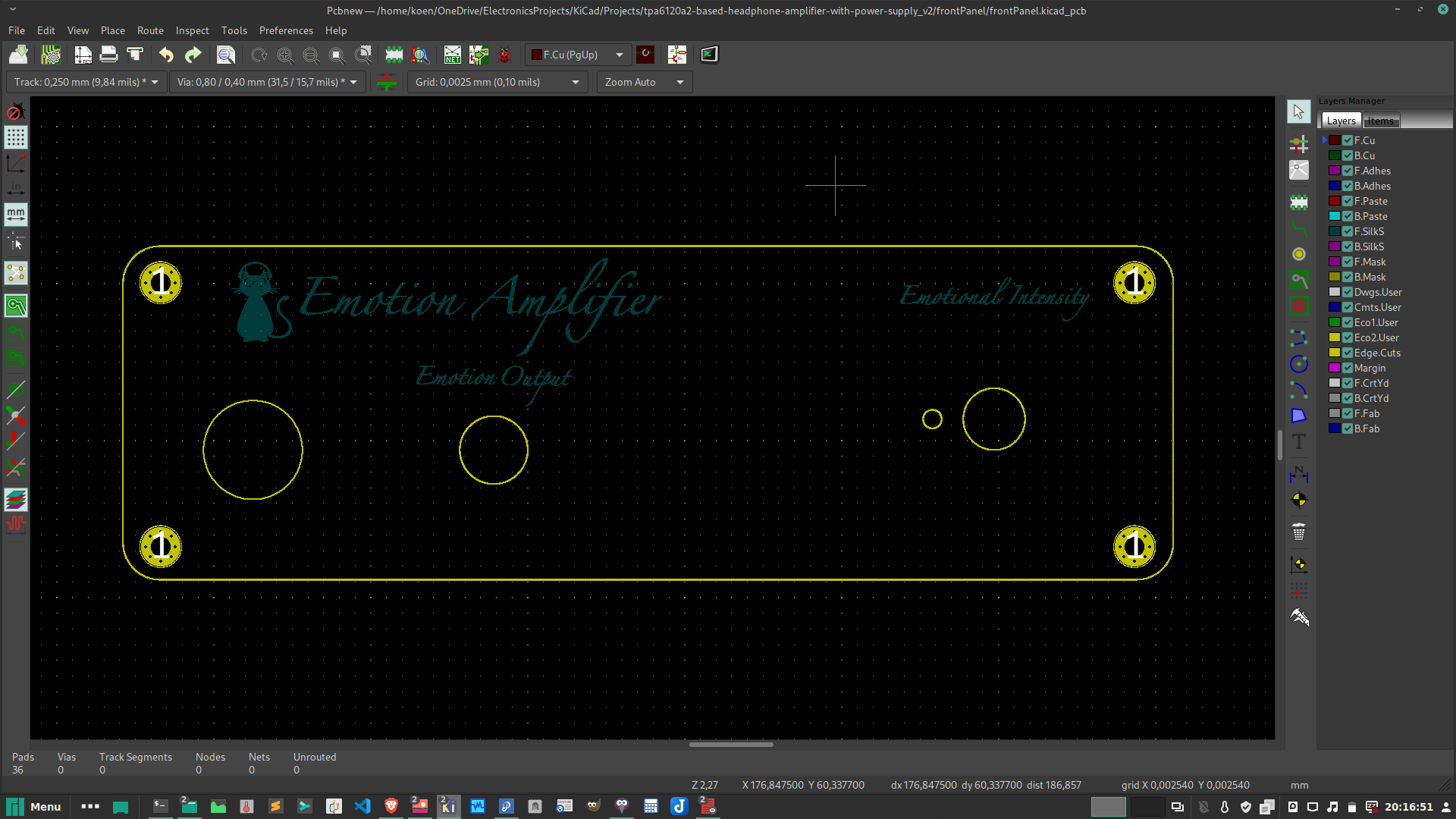 As it turned out, this was a bit less evident than thought and I got some emails from JLCPCB where I ordered the front/back panels that they could not manufacture the PCB because some layers were missing. This was true because there were of course no copper layers for these designs and no drill file neither. I solved this by using mounting holes that act as via’s at the same time for the 4 screws in the corners that hold the panels to the enclosure. That provided a bit of copper on both sides and created a drill file as well since this footprint adds some small via’s as well. With this, I got non empty gerber files which made JLCPCB happy.