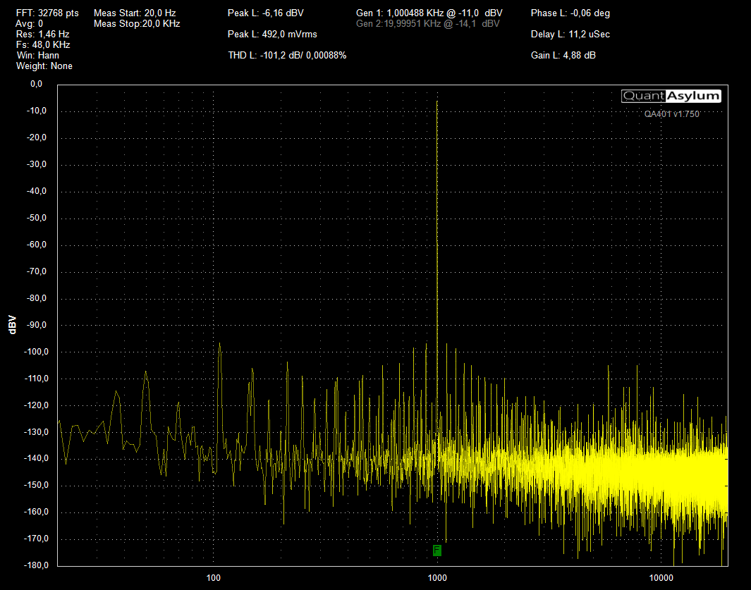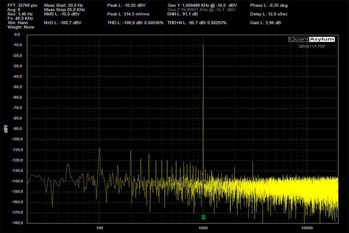 Since I was a bit suspicious that the reason why the prototype sounded so good (even on my Sennheiser HD800 headphones) might be due to lots of harmonic distortion (of the kind human ears seem to like) I decided to buy the QA401 Audio Analyser from QuantAsylum. And I’m happy to report that the Total Harmonic Distortion in both cases is bigger than 100 dB (or less than 0.001%). However, it’s also clear that there is definitely room for improvement.