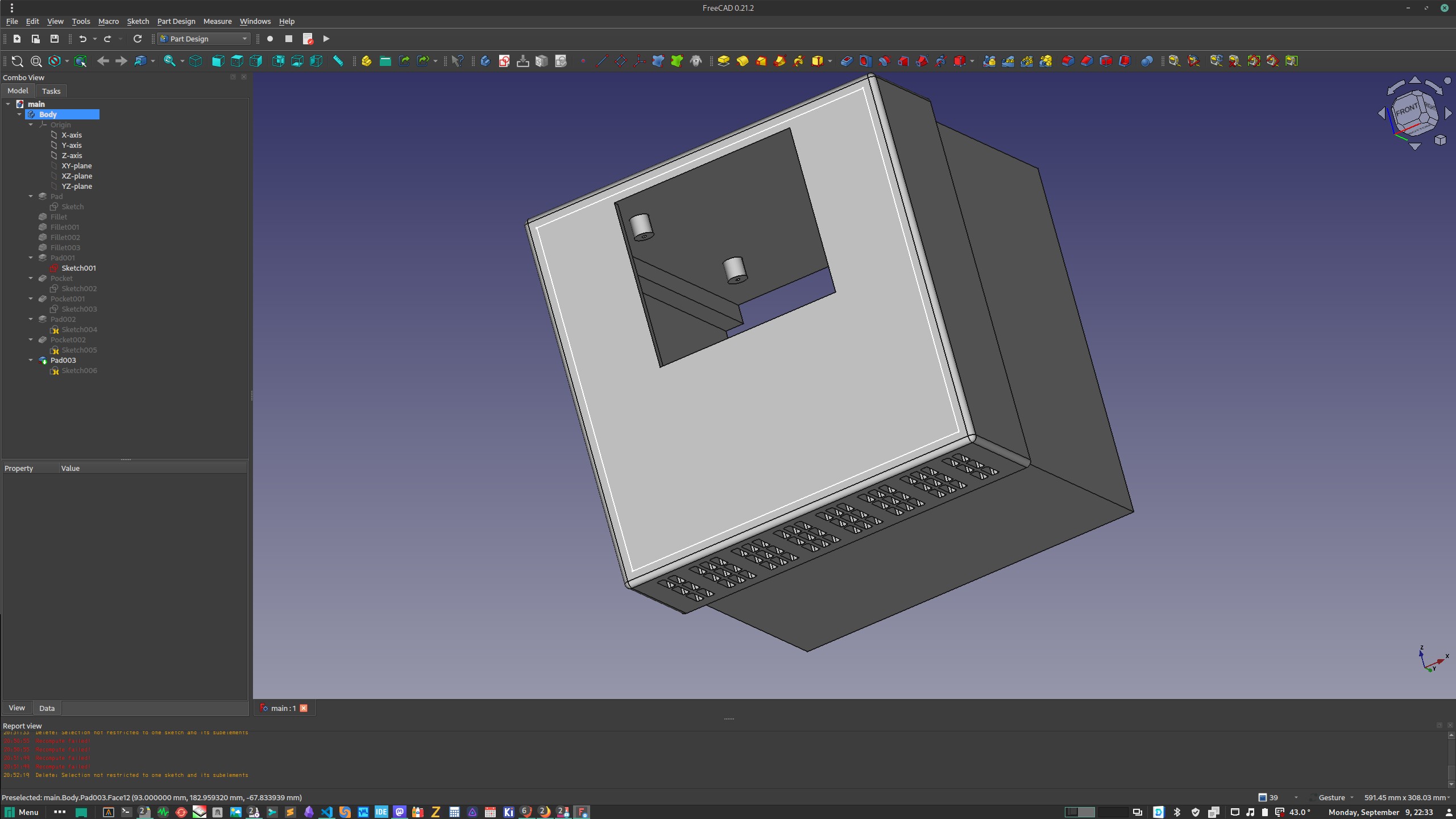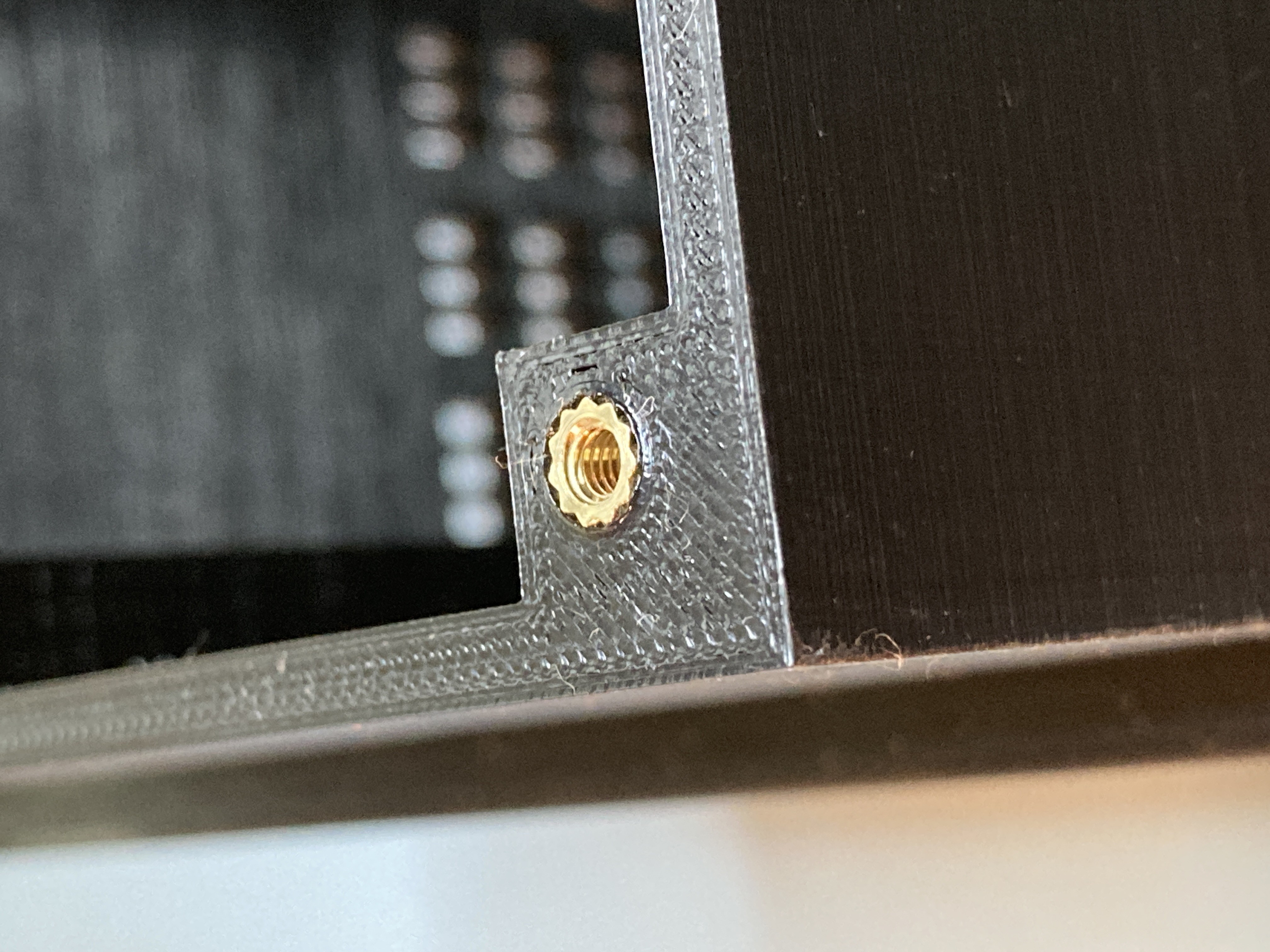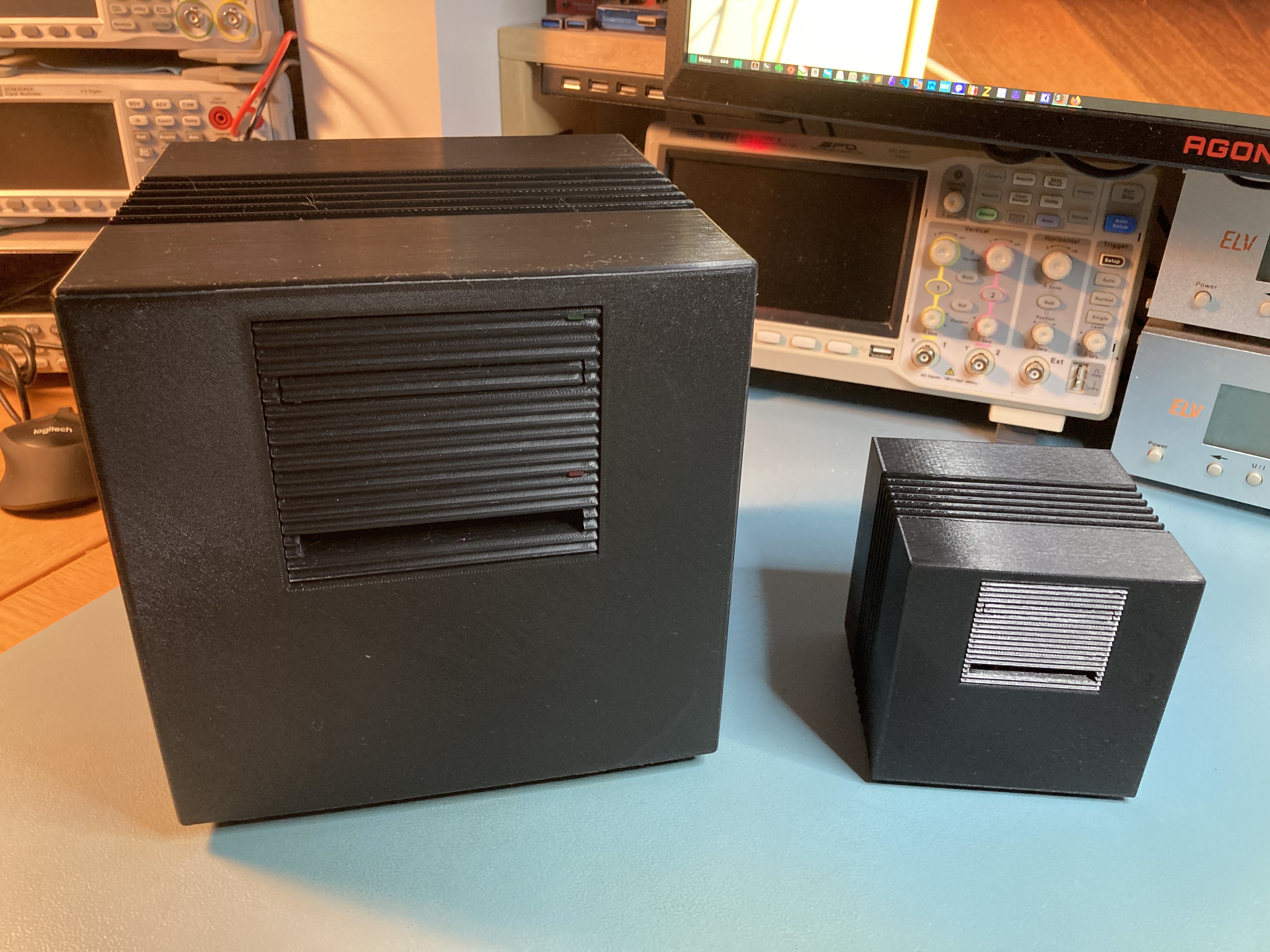 The max size is of course dictated by the max size my 3D printer (a Prusa MK3S) could print and I quickly settled on an edge size 200 mm which is exactly double as the tiny NextCube I already printed. I hoped I could reuse a lot of the original STL files by simply scaling them up by 200%. In the end only the ribbed front panel and feet were reusing the original STL files. I redesigned the other components from scratch mainly so that I could give the case rounded edges like the original NextCube. That gave me finally a good reason to learn FreeCAD as well. So far I always used OpenSCAD.